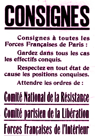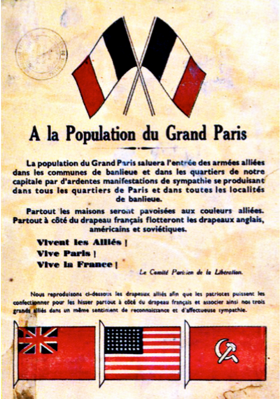 Alors que Paris est sous l’occupation allemande depuis le 14 juin 1940 déjà, les alliés débarqués sur le territoire français à partir du 6 juin 1944 entament leur avancée inexorable vers l’est. La question de la libération de Paris et d’une action insurrectionnelle ou non est alors épineuse. La capitale française est en effet un enjeu important tant pour de Gaulle et le GPRF que pour les alliés. Bien que Paris ne représente pas une place militaire stratégique de premier plan, elle reste très importante d’un point de vue politique et symbolique. De plus, le contexte de l’insurrection reste tendu. C’est en août 1944, que la fameuse libération de Paris se déroule finalement, permettant à de Gaulle de défiler triomphalement sur les Champs Elysées le 25 aout 1945 et de poser les bases d’une nouvelle république française souveraine.